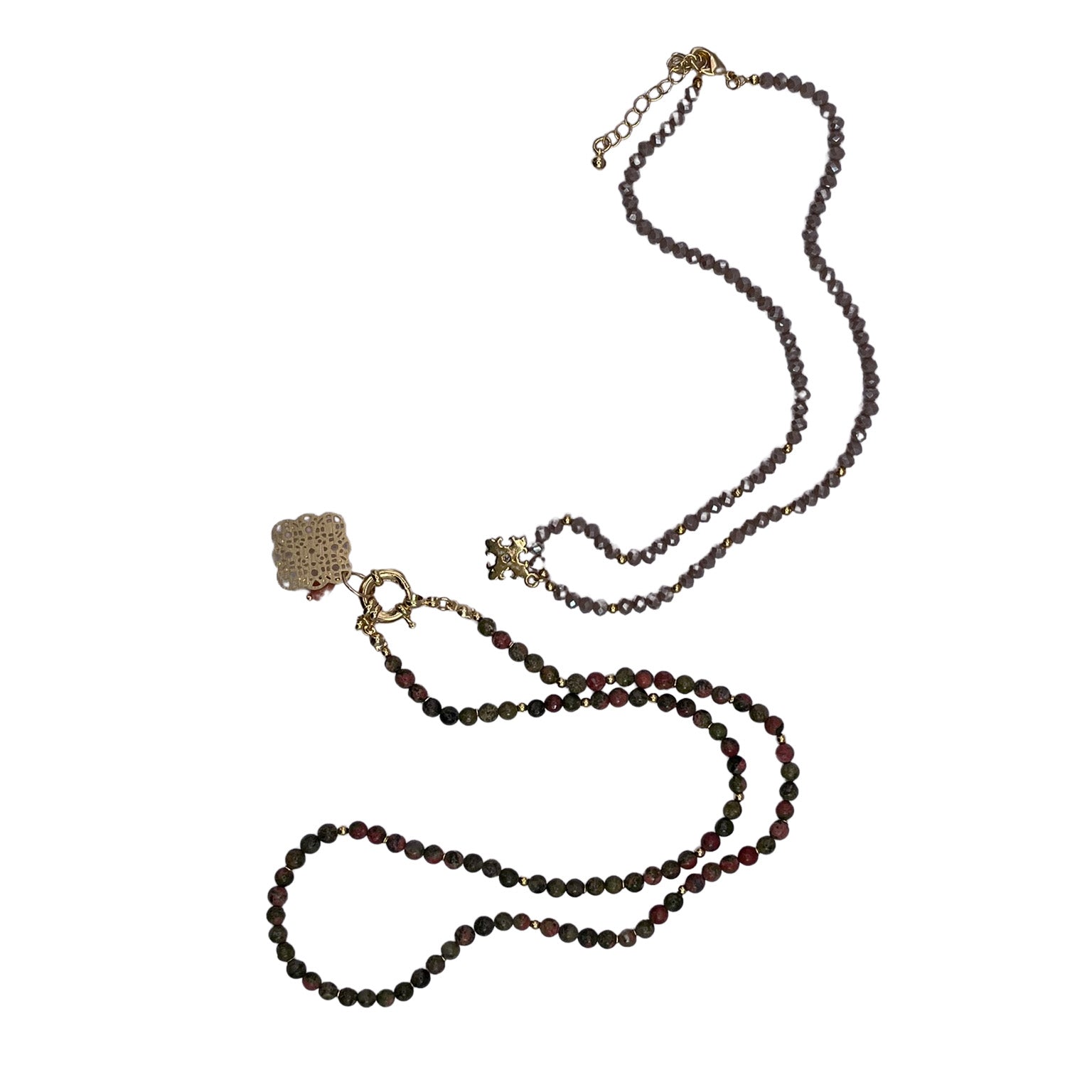 Este dúo incluye un choker en tono beige suave y un collar medio con piedras en matices tierra y dorado, que evocan la calidez de lo silvestre con un toque elegante. Perfecto para elevar tus looks con un aire orgánico y chic 💛