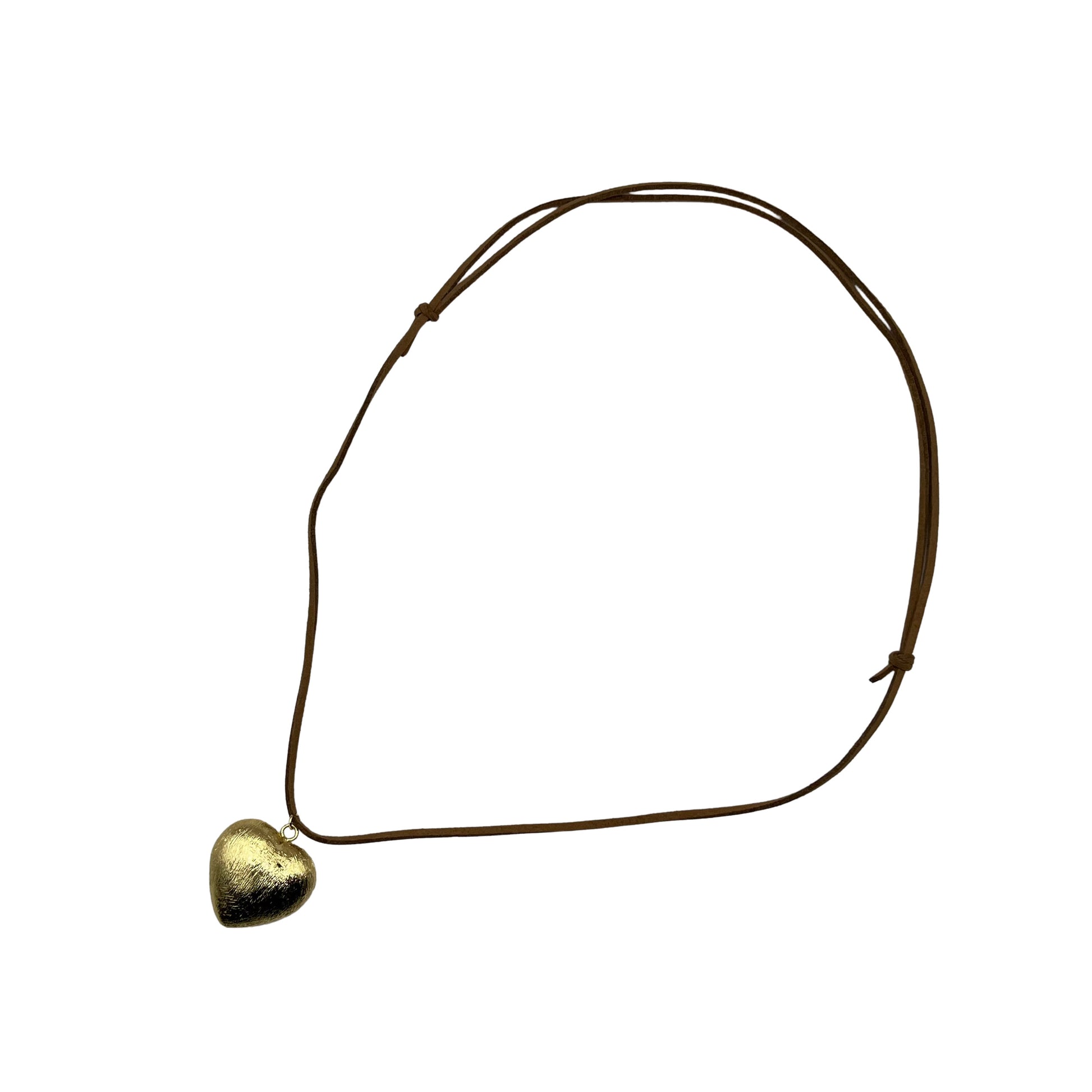 Collar con correa de cuero café y dije en forma de corazón bañado en oro 18k. Su diseño ajustable permite adaptarlo a distintos largos 💖