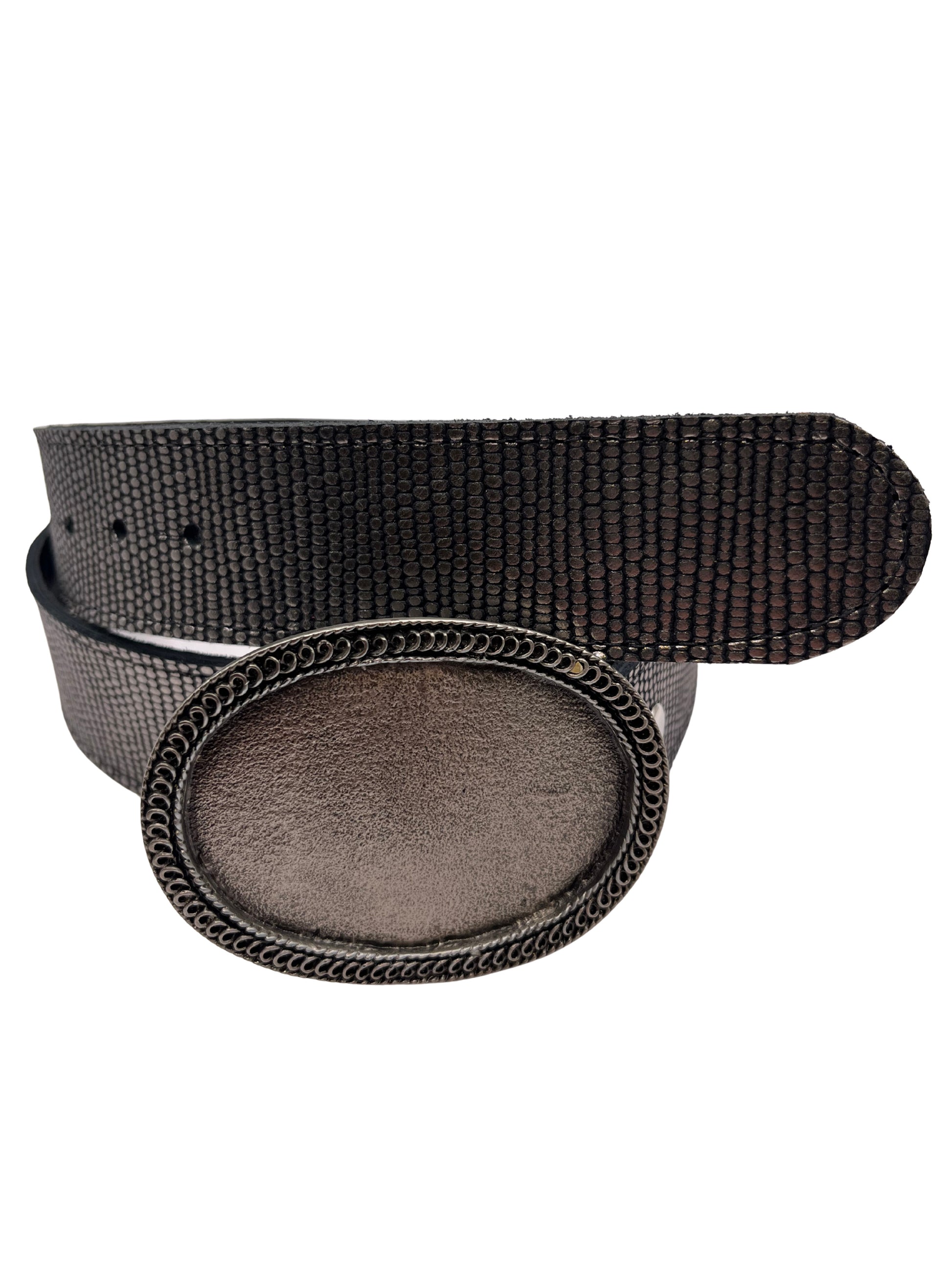 - Cuero genuino de alta calidad texturizado en tono plateado y negro. Ancho 3,8 cm